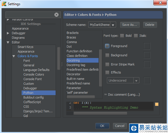 在更改完Pycharm的主題背景之后,你可能對編輯器的外觀仍不滿意,例如你希望將文檔字符串改變為另外一種顏色,下面介紹具體更改方法: