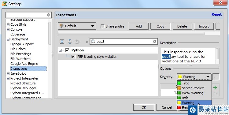 設(shè)置按鈕,然后在Settings/Preferences對話框中的 Inspections 頁面,鍵入PEP8來找到所有相關(guān)選項(xiàng),在對應(yīng)的下拉菜單中選中warning選項(xiàng):