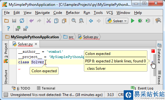 這個(gè)紅色波浪線標(biāo)記了下次代碼輸入的期望位置,在這種情況下,它是一個(gè)預(yù)輸入定義符。鍵入類名Solver,紅色波浪線將會移動到類名之后。如果你將術(shù)鼠標(biāo)指針懸停在波浪線上,將會看到所提示的錯(cuò)誤信息("Colon expected"),當(dāng)然,此時(shí)位于右側(cè)滾動欄的紅色標(biāo)志也會給出相同的錯(cuò)誤信息。