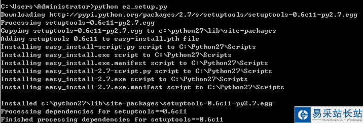 from urllib import urlopendata = urlopen('http://peak.telecommunity.com/dist/ez_setup.py')open('ez_setup.py','wb').write(data.read())exit()執行完畢后可以發現在C:/Users/Administrator目錄下出現了一個ez_setup.py的文件,cmd執行python ez_setup.py,則安裝setuptools完畢