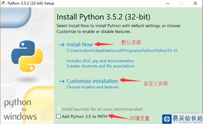 3.1在安裝的時候將下面的 Add Python 3.5 to PATH 前選中時,安裝完畢會自動添加路徑