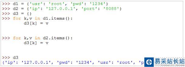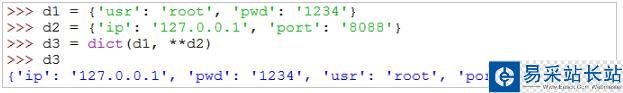 3. dict(d1.items()+d2.items())將合并成的列表轉(zhuǎn)變成新的字典