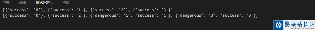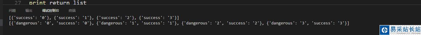 key = ['success', 'dangerous']value = ''# 返回的listresult_list = []index = 0while index < 4: # 中間字典,存儲數據,以及防止append覆蓋 result_dict = {} _key = key[0] value = str(index) result_dict[_key] = value index = index + 1 result_list.append(result_dict)index = 0return_list = []print result_listwhile index < 4: # 中間字典,存儲數據,以及防止append覆蓋 result_dict = {} _key = key[1] value = str(index) result_dict[_key] = value dictMerge = dict(result_list[index].items() + result_dict.items()) return_list.append(dictMerge) index = index + 1print return_list程序輸出: