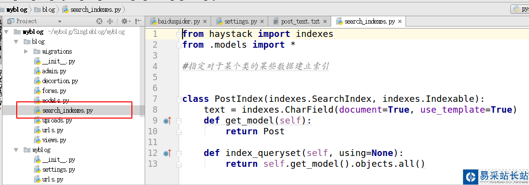 from haystack import indexesfrom models import Post #指定對于某個類的某些數據建立索引class GoodsInfoIndex(indexes.SearchIndex, indexes.Indexable): text = indexes.CharField(document=True, use_template=True) def get_model(self): return Post #搜索的模型類 def index_queryset(self, using=None): return self.get_model().objects.all()