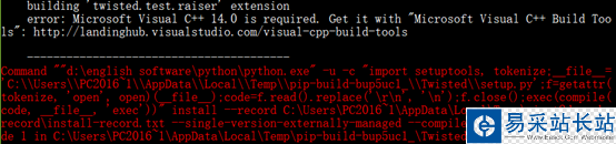 error: Microsoft Visual C++ 14.0 is required.running build_ext building 'twisted.test.raiser' extensionerror: Microsoft Visual C++ 14.0 is required. Get it with "Microsoft Visual C++ Build Tools": http://landinghub.visualstudio.com/visual-cpp-build-tools