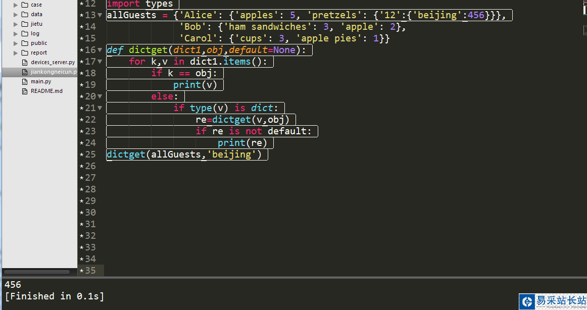#取值import typesallGuests = {'Alice': {'apples': 5, 'pretzels': {'12':{'beijing':456}}},  'Bob': {'ham sandwiches': 3, 'apple': 2},  'Carol': {'cups': 3, 'apple pies': 1}}def dictget(dict1,obj,default=None): for k,v in dict1.items(): if k == obj:  print(v) else:  if type(v) is dict:  re=dictget(v,obj)  if re is not default:   print(re)dictget(allGuests,'beijing')結果: