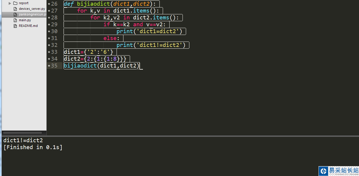 def bijiaodict(dict1,dict2): for k,v in dict1.items(): for k2,v2 in dict2.items():  if k==k2 and v==v2:  print('dict1=dict2')  else:  print('dict1!=dict2')dict1={'2':'6'}dict2={2:{1:{1:8}}}bijiaodict(dict1,dict2)結果: