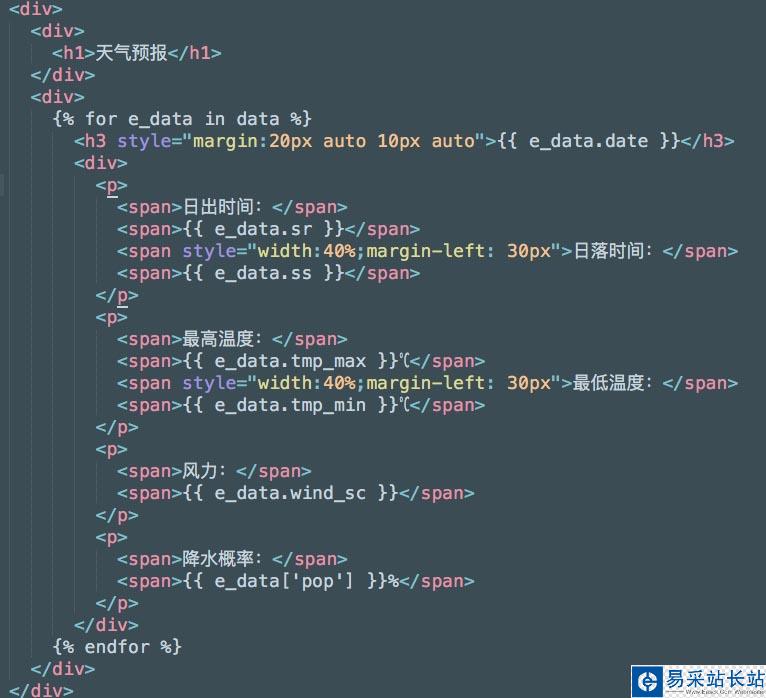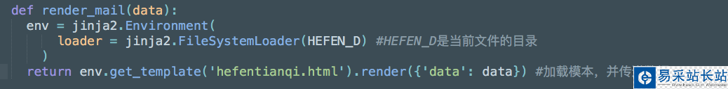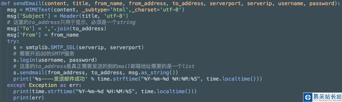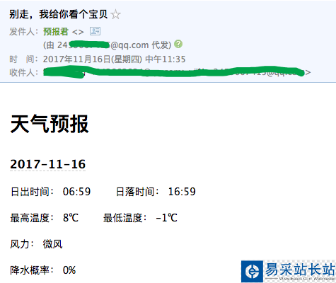 #!/usr/local/bin/python3# coding=utf-8import requestsimport jsonimport smtplibimport jinja2import os.path as pthimport timefrom email.mime.text import MIMETextfrom email.header import HeaderHEFEN_D = pth.abspath(pth.dirname(__file__))LOCATION = '北京'ORIGINAL_URL = 'https://free-api.heweather.com/s6/weather/forecast?parameters'TO = ['8*******@qq.com', '2********@qq.com']def sendEmail(content, title, from_name, from_address, to_address, serverport, serverip, username, password): msg = MIMEText(content, _subtype='html',_charset='utf-8') msg['Subject'] = Header(title, 'utf-8') # 這里的to_address只用于顯示,必須是一個string msg['To'] = ','.join(to_address) msg['From'] = from_name try: s = smtplib.SMTP_SSL(serverip, serverport) s.login(username, password) # 這里的to_address是真正需要發送的到的mail郵箱地址需要的是一個list s.sendmail(from_address, to_address, msg.as_string()) print('%s----發送郵件成功' % time.strftime("%Y-%m-%d %H:%M:%S", time.localtime())) except Exception as err: print(time.strftime("%Y-%m-%d %H:%M:%S", time.localtime())) print(err)def get_data(): new_data = [] parametres = { 'location': LOCATION, 'key': '************ ', #注冊和風天氣會給你一個KEY 'lang': 'zh', 'unit': 'm' } try: response = requests.get(ORIGINAL_URL,params=parametres) r = json.loads(json.dumps(response.text,ensure_ascii=False,indent=1)) r = json.loads(response.text) except Exception as err: print(err) weather_forecast = r['HeWeather6'][0]['daily_forecast'] for data in weather_forecast: new_obj = {} # 日期 new_obj['date'] = data['date'] # 日出時間 new_obj['sr'] = data['sr'] # 日落時間 new_obj['ss'] = data['ss'] # 最高溫度 new_obj['tmp_max'] = data['tmp_max'] # 最低溫度 new_obj['tmp_min'] = data['tmp_min'] # 白天天氣狀況描述 new_obj['cond_txt_d'] = data['cond_txt_d'] # 風向 new_obj['wind_dir'] = data['wind_dir'] # 風力 new_obj['wind_sc'] = data['wind_sc'] # 降水概率 new_obj['pop'] = data['pop'] # 能見度 new_obj['vis'] = data['vis'] new_data.append(new_obj) return new_datadef render_mail(data): env = jinja2.Environment( loader = jinja2.FileSystemLoader(HEFEN_D) ) return env.get_template('hefentianqi.html').render({'data': data})def main(): config = { "from": "2********@qq.com", "from_name": '預報君', "to": TO, "serverip": "smtp.qq.com", "serverport": "465", "username": "2*******@qq.com", "password": "**********" #QQ郵箱的SMTP授權碼 } title = "別走,我給你看個寶貝" data = get_data() body = render_mail(data) sendEmail(body, title, config['from_name'], config['from'], config['to'], config['serverport'], config['serverip'], config['username'], config['password'])main()