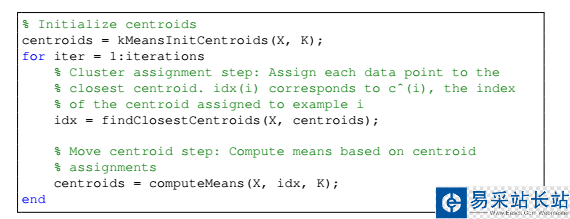tmp = zeros(K,1);for i = 1:size(X,1)for j = 1:Ktmp(j) = sum((X(i,:) - centroids(j,:)).^2);end[mins,index]=min(tmp);idx(i) = index;end