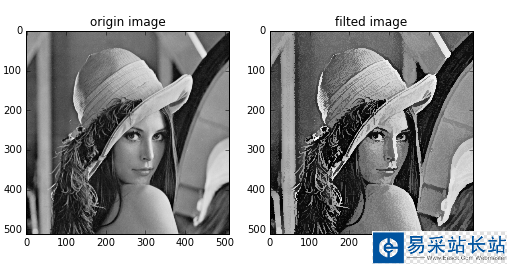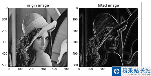from skimage import data,colorimport matplotlib.pyplot as pltfrom skimage.morphology import diskimport skimage.filters.rank as sfrimg =color.rgb2gray(data.lena())auto =sfr.enhance_contrast(img, disk(5)) #半徑為5的圓形濾波器plt.figure('filters',figsize=(8,8))plt.subplot(121)plt.title('origin image')plt.imshow(img,plt.cm.gray)plt.subplot(122)plt.title('filted image')plt.imshow(auto,plt.cm.gray)
