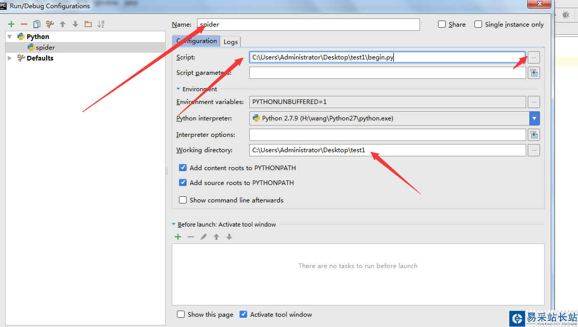 9. Name:改成spider; script:選擇剛才新建的那個begin.py文件;Working Direciton:改成自己的工作目錄