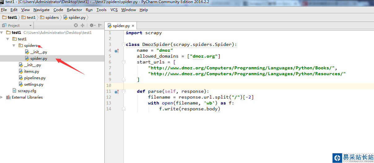 在test1目錄和scrapy.cfg同級目錄下面,新建一個begin.py文件(便于理解可以寫成main.py),注意箭頭2所指的名字和第5步中的name='dmoz'名字是一樣的。