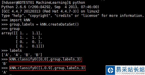 編輯完成后保存,linux下確保當前路徑為存儲kNN.py文件的位置,進入python開發環境開始測試: