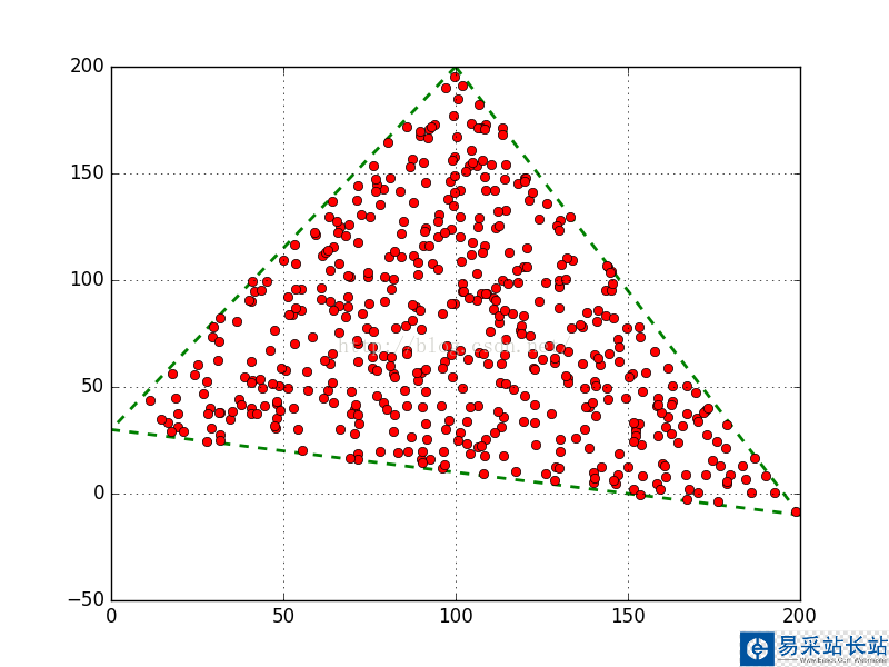 import numpy as np import matplotlib.pyplot as plt if __name__ == '__main__': x1, y1 = 0, 30 x3, y3 = 200, -10 x2, y2 = 100, 200 sample_size = 500 theta = np.arange(0,1,0.001) x = theta * x1 + (1 - theta) * x2 y = theta * y1 + (1 - theta) * y2 plt.plot(x,y,'g--',linewidth=2) x = theta * x1 + (1 - theta) * x3 y = theta * y1 + (1 - theta) * y3 plt.plot(x, y, 'g--', linewidth=2) x = theta * x2 + (1 - theta) * x3 y = theta * y2 + (1 - theta) * y3 plt.plot(x, y, 'g--', linewidth=2) rnd1 = np.random.random(size = sample_size) rnd2 = np.random.random(size=sample_size) rnd2 = np.sqrt(rnd2) x = rnd2 * (rnd1 * x1 + (1 - rnd1) * x2) + (1 - rnd2) * x3 y = rnd2 * (rnd1 * y1 + (1 - rnd1) * y2) + (1 - rnd2) * y3 plt.plot(x,y,'ro') plt.grid(True) # plt.savefig('demo.png') plt.show()生成圖: