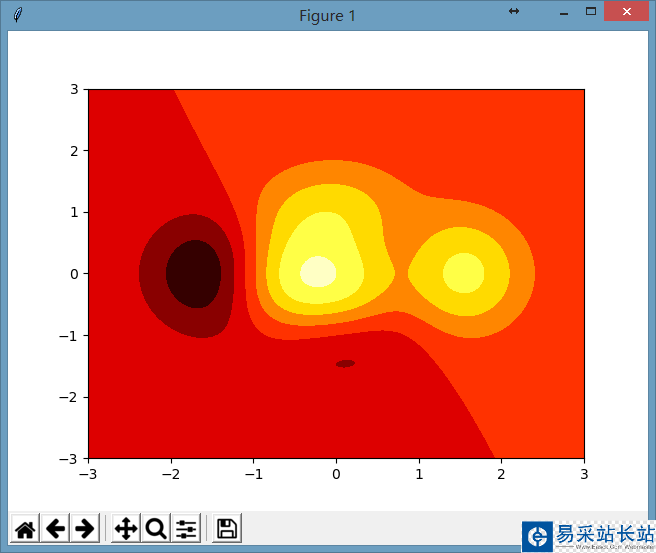 這顏色有點太冷了,我們想顯示熱力圖,那只要在plt.contourf()函數中添加屬性cmap=plt.cm.hot就能顯示熱力圖,其中cmap代表為color map,我們把color map映射成hot(熱力圖),此處關鍵代碼為: