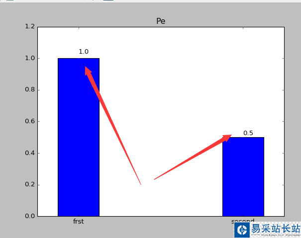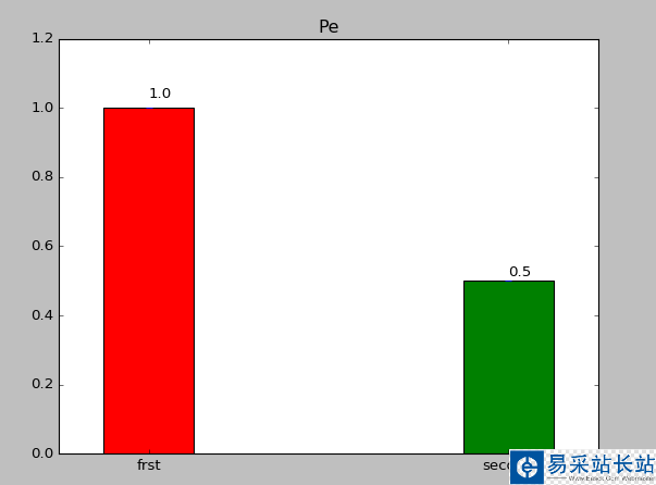 import numpy as npimport matplotlib.pyplot as pltfrom matplotlib import mlabfrom matplotlib import rcParamsfig1 = plt.figure(2)rects =plt.bar(left = (0.2,1),height = (1,0.5),color=('r','g'),width = 0.2,align="center",yerr=0.000001)plt.title('Pe')def autolabel(rects): for rect in rects: height = rect.get_height() plt.text(rect.get_x()+rect.get_width()/2., 1.03*height, '%s' % float(height))autolabel(rects)plt.xticks((0.2,1),('frst','second'))plt.show()