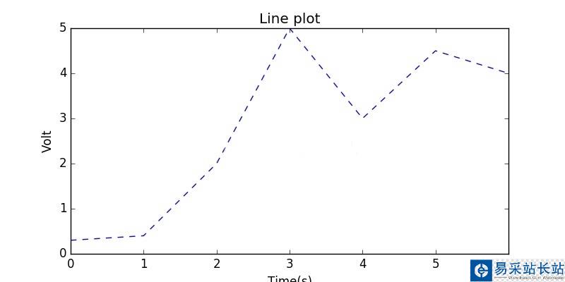 # -*- coding: utf-8 -*- import numpy as np import matplotlib.pyplot as plt #X軸,Y軸數據 x = [0,1,2,3,4,5,6] y = [0.3,0.4,2,5,3,4.5,4] plt.figure(figsize=(8,4)) #創建繪圖對象 plt.plot(x,y,"b--",linewidth=1) #在當前繪圖對象繪圖(X軸,Y軸,藍色虛線,線寬度) plt.xlabel("Time(s)") #X軸標簽 plt.ylabel("Volt") #Y軸標簽 plt.title("Line plot") #圖標題 plt.show() #顯示圖 plt.savefig("line.jpg") #保存圖 結果如下: