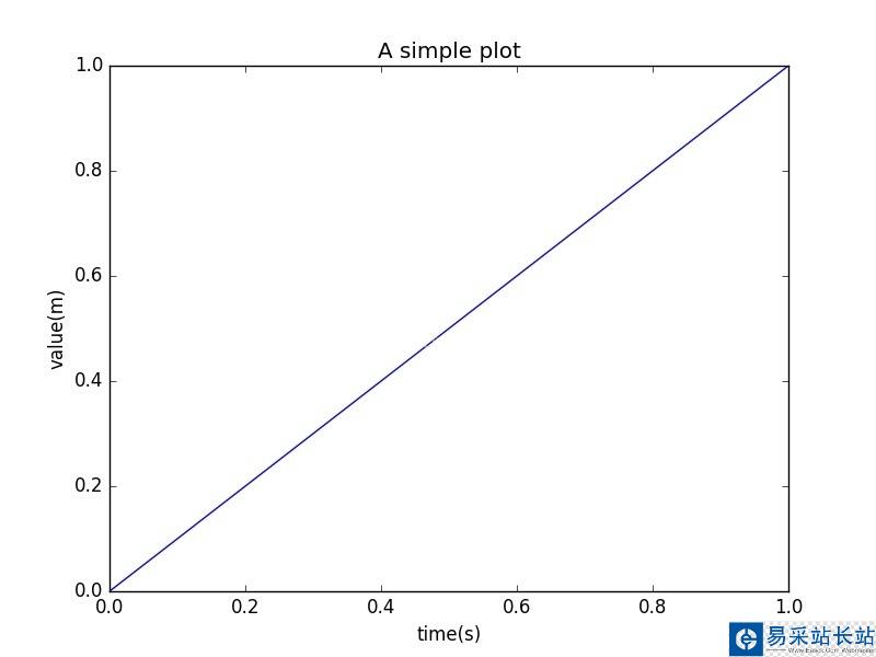import numpy as np import matplotlib.pyplot as plt x=[0,1] y=[0,1] plt.figure() plt.plot(x,y) plt.xlabel("time(s)") plt.ylabel("value(m)") plt.title("A simple plot") 結果如下: