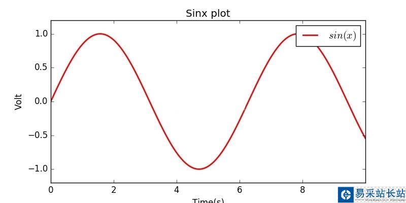 # -*- coding: utf-8 -*- import numpy as np import matplotlib.pyplot as plt #設置x,y軸的數值(y=sinx) x = np.linspace(0, 10, 1000) y = np.sin(x) #創建繪圖對象,figsize參數可以指定繪圖對象的寬度和高度,單位為英寸,一英寸=80px plt.figure(figsize=(8,4)) #在當前繪圖對象中畫圖(x軸,y軸,給所繪制的曲線的名字,畫線顏色,畫線寬度) plt.plot(x,y,label="$sin(x)$",color="red",linewidth=2) #X軸的文字 plt.xlabel("Time(s)") #Y軸的文字 plt.ylabel("Volt") #圖表的標題 plt.title("PyPlot First Example") #Y軸的范圍 plt.ylim(-1.2,1.2) #顯示圖示 plt.legend() #顯示圖 plt.show() #保存圖 plt.savefig("sinx.jpg") 結果如下: