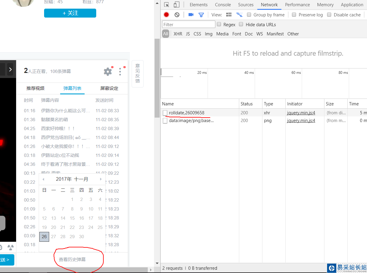 在查看歷史彈幕中任選一天,查看,會發出新的請求