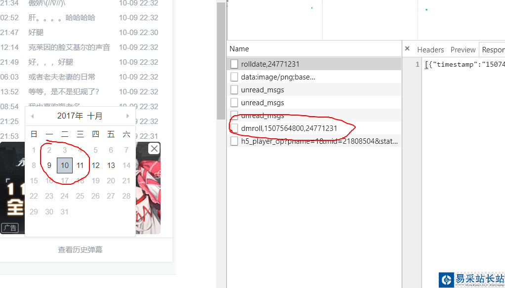 dmroll ,時間戳,彈幕號,表示獲取該日期的彈幕,1507564800 表示2017/10/10 0:0:0