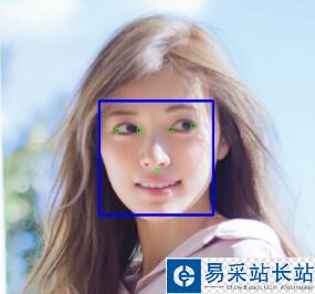 # dlib人臉關鍵點檢測器 predictor_path = "shape_predictor_5_face_landmarks.dat" predictor = dlib.shape_predictor(predictor_path) # dlib正臉檢測器 detector = dlib.get_frontal_face_detector() # 正臉檢測 dets = detector(img, 1) # 如果檢測到人臉 if len(dets)>0: for d in dets: x,y,w,h = d.left(),d.top(), d.right()-d.left(), d.bottom()-d.top() # x,y,w,h = faceRect cv2.rectangle(img,(x,y),(x+w,y+h),(255,0,0),2,8,0) # 關鍵點檢測,5個關鍵點 shape = predictor(img, d) for point in shape.parts(): cv2.circle(img,(point.x,point.y),3,color=(0,255,0)) cv2.imshow("image",img) cv2.waitKey() 這部分效果如下圖: