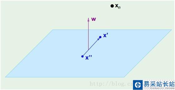 因此W垂直于超面。知道了W垂直于超面,那么Xn到超面的距離其實(shí)就是Xn和超面上任意一點(diǎn)x的連線在W上的投影,如(圖四)所示: