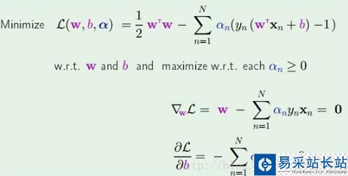在(公式五)中通過(guò)拉格朗日乘子法函數(shù)分別對(duì)W和b求導(dǎo),為了得到極值點(diǎn),令導(dǎo)數(shù)為0,得到