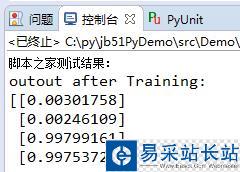 # -*- coding:utf-8 -*-#! python2import numpy as np#sigmoid functiondef nonlin(x, deriv = False): if(deriv == True): return x*(1-x) return 1/(1+np.exp(-x))#input datasetx = np.array([[0,0,1], [0,1,1], [1,0,1], [1,1,1]])#output datasety = np.array([[0,0,1,1]]).Tnp.random.seed(1)#init weight valuesyn0 = 2*np.random.random((3,1))-1print "武林站長站測試結果:"for iter in xrange(100000): l0 = x #the first layer,and the input layer l1 = nonlin(np.dot(l0,syn0)) #the second layer,and the output layer l1_error = y-l1 l1_delta = l1_error*nonlin(l1,True) syn0 += np.dot(l0.T, l1_delta)print "outout after Training:"print l1