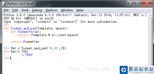 def format_and_pad(template, space): def formatter(x): return (template % x).rjust(space) return formatter# 創建一個始終返回15位字符串的浮點數格式化器fmt = format_and_pad('%.4f',15)fmt(1.756)運行結果: