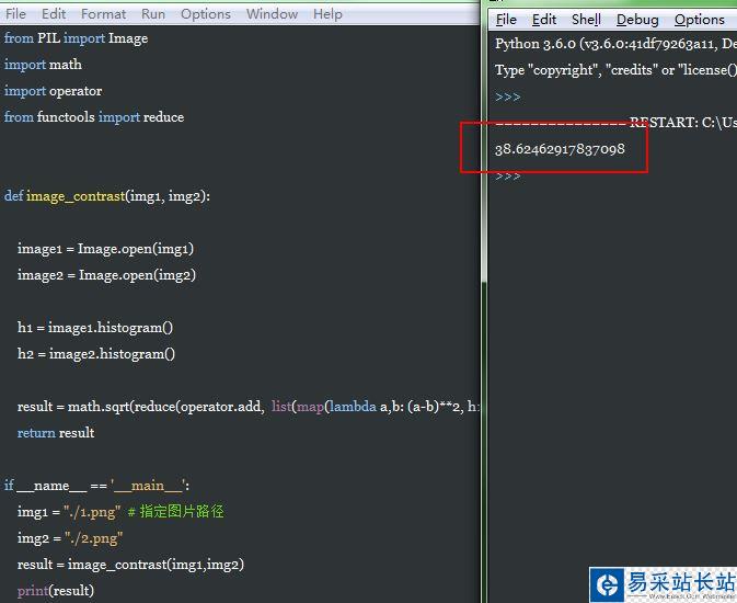 from PIL import Imageimport mathimport operatorfrom functools import reducedef image_contrast(img1, img2): image1 = Image.open(img1) image2 = Image.open(img2) h1 = image1.histogram() h2 = image2.histogram() result = math.sqrt(reduce(operator.add, list(map(lambda a,b: (a-b)**2, h1, h2)))/len(h1) ) return resultif __name__ == '__main__': img1 = "./1.png" # 指定圖片路徑 img2 = "./2.png" result = image_contrast(img1,img2) print(result)
