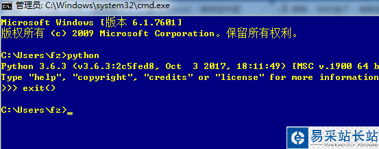 完成步驟3之后,python已經(jīng)被成功安裝到我們的機器中,此時在>>>后輸入exit(),點擊回車,則退出python交互環(huán)境,或直接關閉命令行窗口也可。