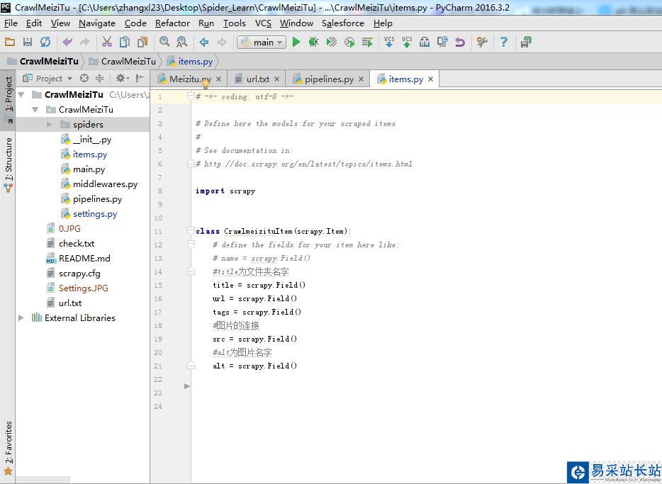 Items主要用來存取通過Spider程序抓取的信息。由于我們爬取妹子圖,所以要抓取每張圖片的名字,圖片的連接,標簽等等