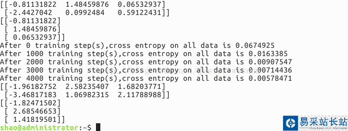 首先是打印出訓(xùn)練之前的網(wǎng)絡(luò)參數(shù),也就是隨機(jī)產(chǎn)生的參數(shù)值,然后將訓(xùn)練過程中每隔1000次的交叉熵輸出,發(fā)現(xiàn)交叉熵在逐漸減小,說明分類的性能在變好。最后是訓(xùn)練網(wǎng)絡(luò)結(jié)束后網(wǎng)絡(luò)的參數(shù)。