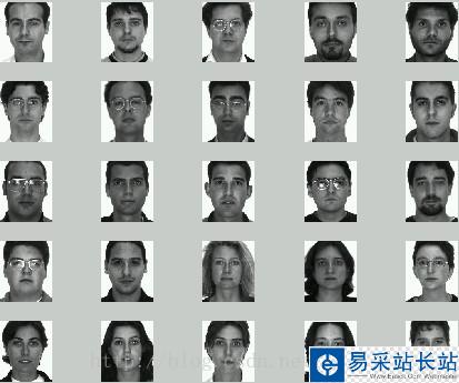 步驟一:獲取包含M張人臉圖像的集合S。在我們的例子里有25張人臉圖像(雖然是25個不同人的人臉的圖像,但是看著怎么不像呢,難道我有臉盲癥么),如下圖所示哦。每張圖像可以轉換成一個N維的向量(是的,沒錯,一個像素一個像素的排成一行就好了,至于是橫著還是豎著獲取原圖像的像素,隨你自己,只要前后統一就可以),然后把這M個向量放到一個集合S里,如下式所示。