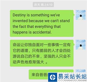#不要抄下源碼就運行,你需要改動幾個地方from __future__ import unicode_literalsfrom threading import Timerfrom wxpy import *import requestsfrom wechat_sender import Sender#bot = Bot()bot = Bot(console_qr=2,cache_path="botoo.pkl") #這里的二維碼是用像素的形式打印出來!,如果你在win環境上運行,替換為 bot=Bot()def get_news1(): #獲取金山詞霸每日一句,英文和翻譯 url = "http://open.iciba.com/dsapi/" r = requests.get(url) contents = r.json()['content'] translation= r.json()['translation'] return contents,translationdef send_news(): try: my_friend = bot.friends().search(u'徒手敬歲月')[0] #你朋友的微信名稱,不是備注,也不是微信帳號。 my_friend.send(get_news1()[0]) my_friend.send(get_news1()[1][5:]) my_friend.send(u"來自爸爸的心靈雞湯!") t = Timer(86400, send_news) #每86400秒(1天),發送1次,不用linux的定時任務是因為每次登陸都需要掃描二維碼登陸,很麻煩的一件事,就讓他一直掛著吧 t.start() except: my_friend = bot.friends().search('常念')[0] #你的微信名稱,不是微信帳號。 my_friend.send(u"今天消息發送失敗了") if __name__ == "__main__": send_news()最終效果是這樣的: