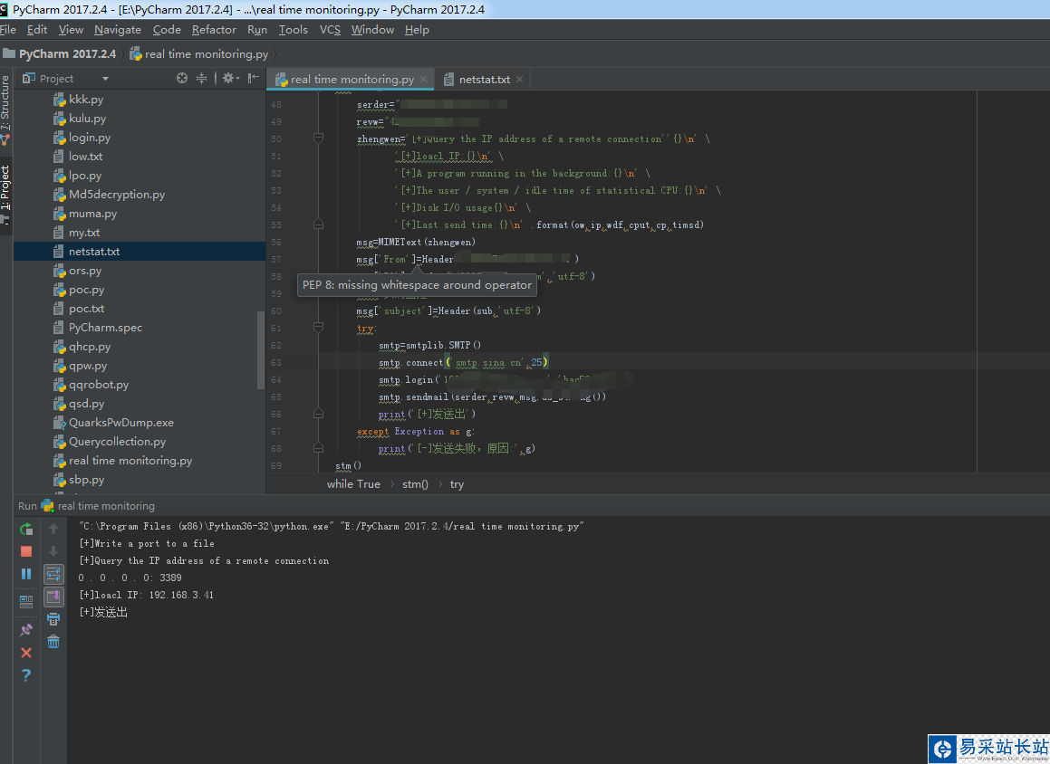 import osimport timeimport reimport smtplibfrom email.mime.text import MIMETextfrom email.header import Headerimport socketimport psutilwhile True: def jianca(): print('[+]Write a port to a file') querys=os.popen('netstat -an').read() wsd=open('netstat.txt','w') wsd.write(querys) wsd.close() jianca() def swsd(): global usd,ow wsd=open('netstat.txt','r') swd=wsd.read() odf=re.findall('(25[0-5]|2[0-4]/d|[0-1]/d{2}|[1-9]?/d)/.(25[0-5]|2[0-4]/d|[0-1]/d{2}|[1-9]?/d)/.(25[0-5]|2[0-4]/d|[0-1]/d{2}|[1-9]?/d)/.(25[0-5]|2[0-4]/d|[0-1]/d{2}|[1-9]?/d):(3389)',swd) usd=odf[0] print('[+]Query the IP address of a remote connection') df=usd[0],usd[1],usd[1],usd[3] wdst=".".join(df) ow=wdst+":"+usd[4] print(usd[0],'.',usd[1],'.',usd[2],'.',usd[3]+":",usd[4]) swsd() def ipdw(): global wdf,ip,timsd s=socket.socket(socket.AF_INET,socket.SOCK_DGRAM) dw=s.connect(('8.8.8.8',80)) ip=s.getsockname()[0] print('[+]loacl IP:',ip) wdf=os.popen('tasklist').read() timsd=time.strftime('%Y-%m-%d',time.localtime(time.time())) ipdw() def yunwei(): global cput,cp cput=psutil.cpu_times() cp=psutil.disk_io_counters() yunwei() def stm(): serder="搜狐郵箱@sina.cn" revw="收件箱@qq.com" zhengwen='[+]Query the IP address of a remote connection''{}/n' / '[+]loacl IP:{}/n' / '[+]A program running in the background:{}/n' / '[+]The user / system / idle time of statistical CPU:{}/n' / '[+]Disk I/O usage{}/n' / '[+]Last send time:{}/n' .format(ow,ip,wdf,cput,cp,timsd) msg=MIMEText(zhengwen) msg['From']=Header('你的搜狐郵箱@sina.cn') msg['TO']=Header('收件箱@qq.com','utf-8') sub="實時監控" msg['subject']=Header(sub,'utf-8') try: smtp=smtplib.SMTP() smtp.connect('smtp.sina.cn',25) smtp.login('搜狐郵箱@sina.cn','登錄密碼') smtp.sendmail(serder,revw,msg.as_string()) print('[+]發送出') except Exception as g: print('[-]發送失敗,原因:',g) stm() time.sleep(3600)實現原理:首先獲取端口狀態,然后寫人一個txt用正則提取出想要的IP和端口。