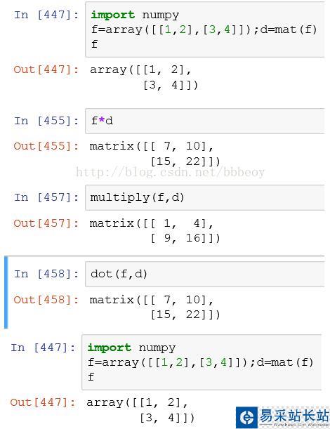 總結:數組乘法默認的是點乘,矩陣默認的是矩陣乘法,混合在一起默認的是矩陣乘法,multiply轉化為對應元素的乘積,dot(d,f)會轉化為矩陣的乘積,注意,像multiply不滿足對應元素時,按照廣播是方式進行。