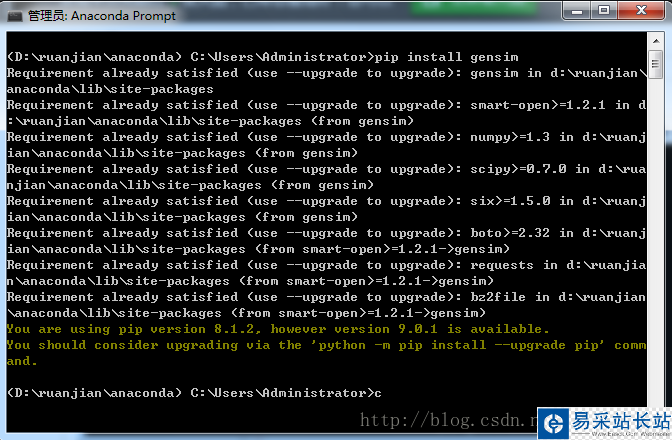 在anaconda命令窗口中,輸入pip install gensim
