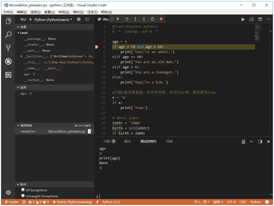 這里需要提醒一下的是,左上角的下拉選擇調試模式中,常用的兩個是Python和Integrated Terminal/Console,第一個就是在插件自帶的環境中調試運行,第二個就是集成的控制臺中。問題是,第一種暫不支持input()輸入,所以想調試帶input的程序,就選擇Integrated Terminal/Console或者External Terminal/Console也是可以的。