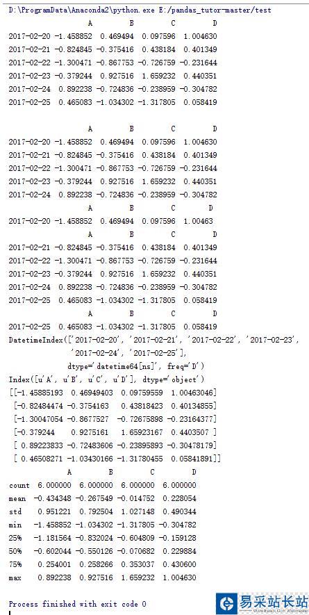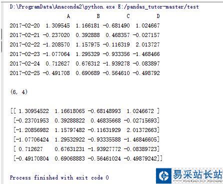 import numpy as np import pandas as pd #以20170220為基點向后生產時間點 dates = pd.date_range('20170220',periods=6) #DataFrame生成函數,行索引為時間點,列索引為ABCD data = pd.DataFrame(np.random.randn(6,4),index=dates,columns=list('ABCD')) print data print print data.shape print print data.values