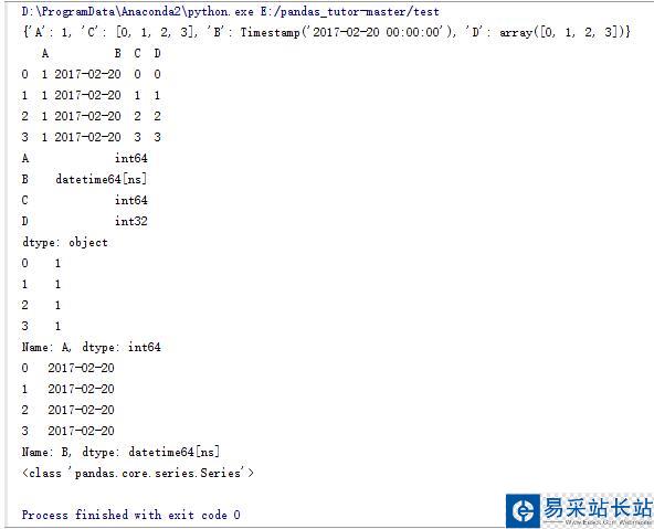 import numpy as npimport pandas as pd#設計一個字典d_data = {'A':1,'B':pd.Timestamp('20170220'),'C':range(4),'D':np.arange(4)}print d_data#使用字典生成一個DataFramedf_data = pd.DataFrame(d_data)print df_data#DataFrame中每一列的類型print df_data.dtypes#打印A列print df_data.A#打印B列print df_data.B#B列的類型print type(df_data.B)