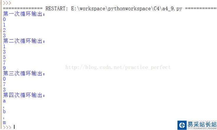 print('第一次循環輸出:')for i in range(4): print(i)print('第二次循環輸出:')for i in range(1,11,2): print(i)# 2.下面是依次枚舉輸出[]中數字