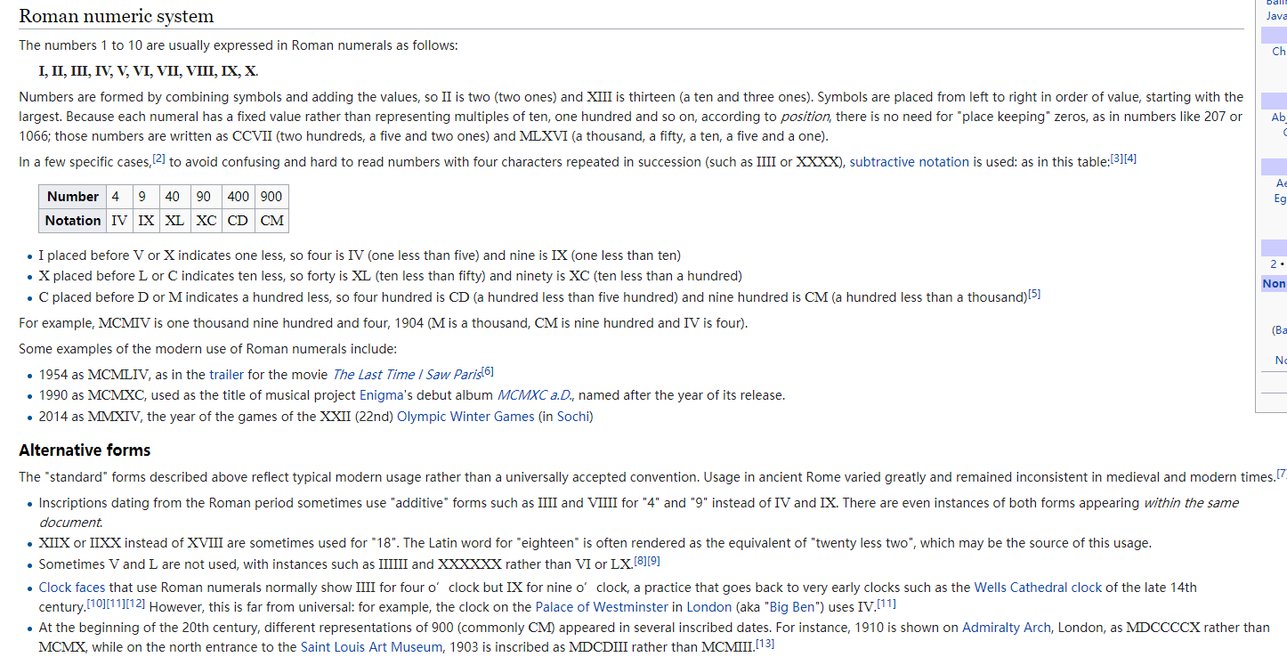題目很簡單,如果之前也做過這種題目的話,相信對于什么是羅馬數(shù)字就不會很陌生了,羅馬數(shù)字是很古老的計數(shù)方法,現(xiàn)在的一些地方還有見到它的使用,下面簡單貼兩張維基百科的圖片簡單回顧一下羅馬數(shù)字: