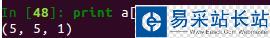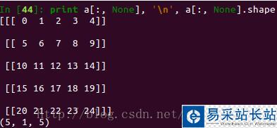 這里應該是大家最疑惑的地方了,為什么列的參數改成None,輸出的shape都變了,這里大家要知道,None代表新增加一個維度,它有一個別稱叫newaxis,大家可以輸出一下numpy.newaxis就知道了,那么這個別稱應該顧名思義了吧。那么為什么是5x1x5,而不是5x5x1呢,那是因為你在第二維上用了None,你如果在第三維上用就會變成5x5x1了,不信你看