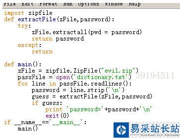 我們可以用拋出的異常測試我們的字典文件,在這里為了簡便直接新建了一個“dictionary.txt”文件,其中有zip文件的密碼,我們需要遍歷字典中的每個單詞。如果extractall執行成功則輸出密碼,否則拋出異常,忽略這個異常,再測試下一個密碼。