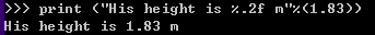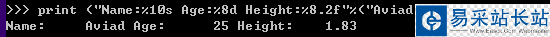 print ("Name:%-10s Age:%-8d Height:%-8.2f"%("Aviad",25,1.83))