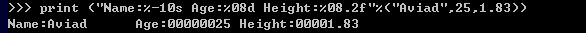 print ("Name:%-10s Age:%08d Height:%08.2f"%("Aviad",25,1.83))