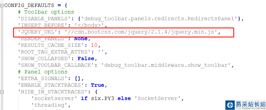 打開settings文件后找得到(CONFIG_DEFAULTS) 變量 , 修改key: JQUERY_URL的value。