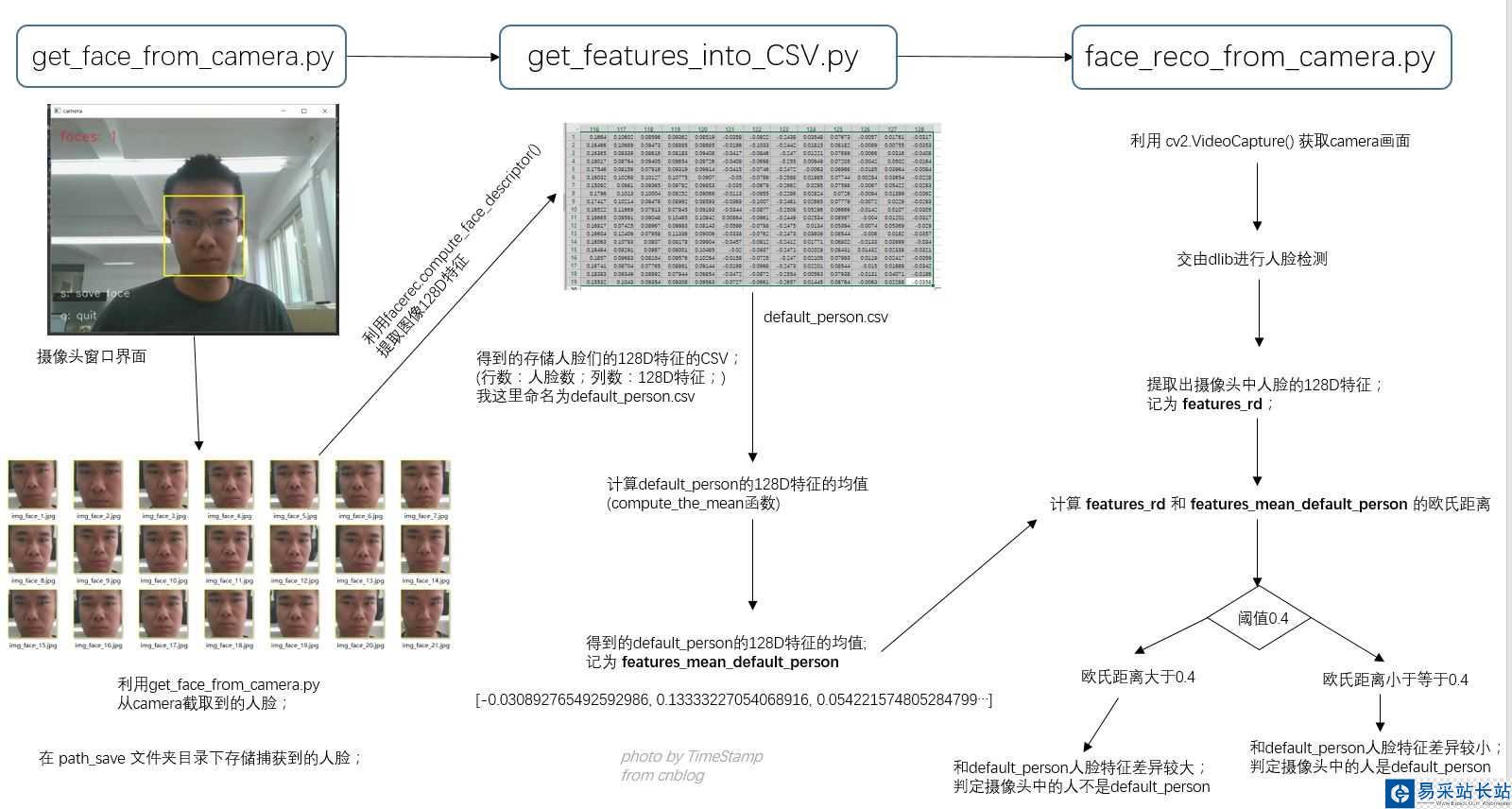 核心就是提取128D人臉特征,然后計算攝像頭人臉特征和預設的特征臉的歐式距離,進行比對;